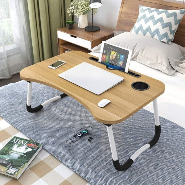 Con estructura portátil, amplia superficie, patas antideslizantes y diseño estable. Incluye porta vasos y ranura para dispositivos 🥤📱
