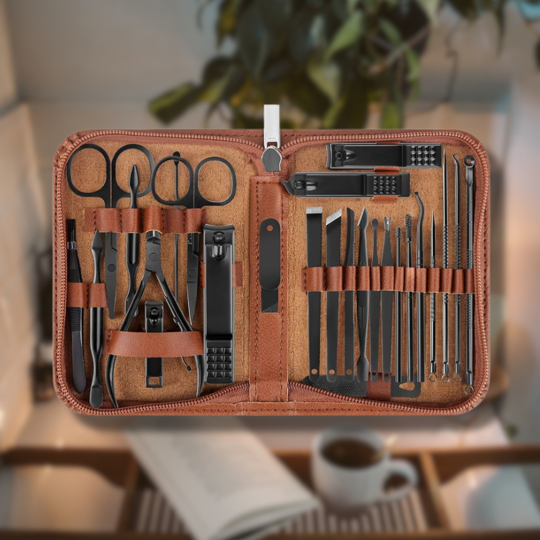 💅 Todo en un solo kit: lima, cortaúñas, empujador de cutículas, tijeras, removedor de durezas y más.